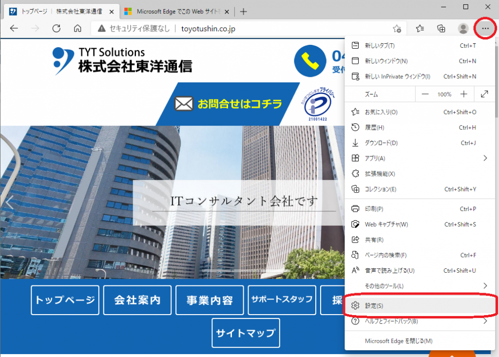 1:エッジを起動し、右上の・・・を選んでから、設定を選びます。